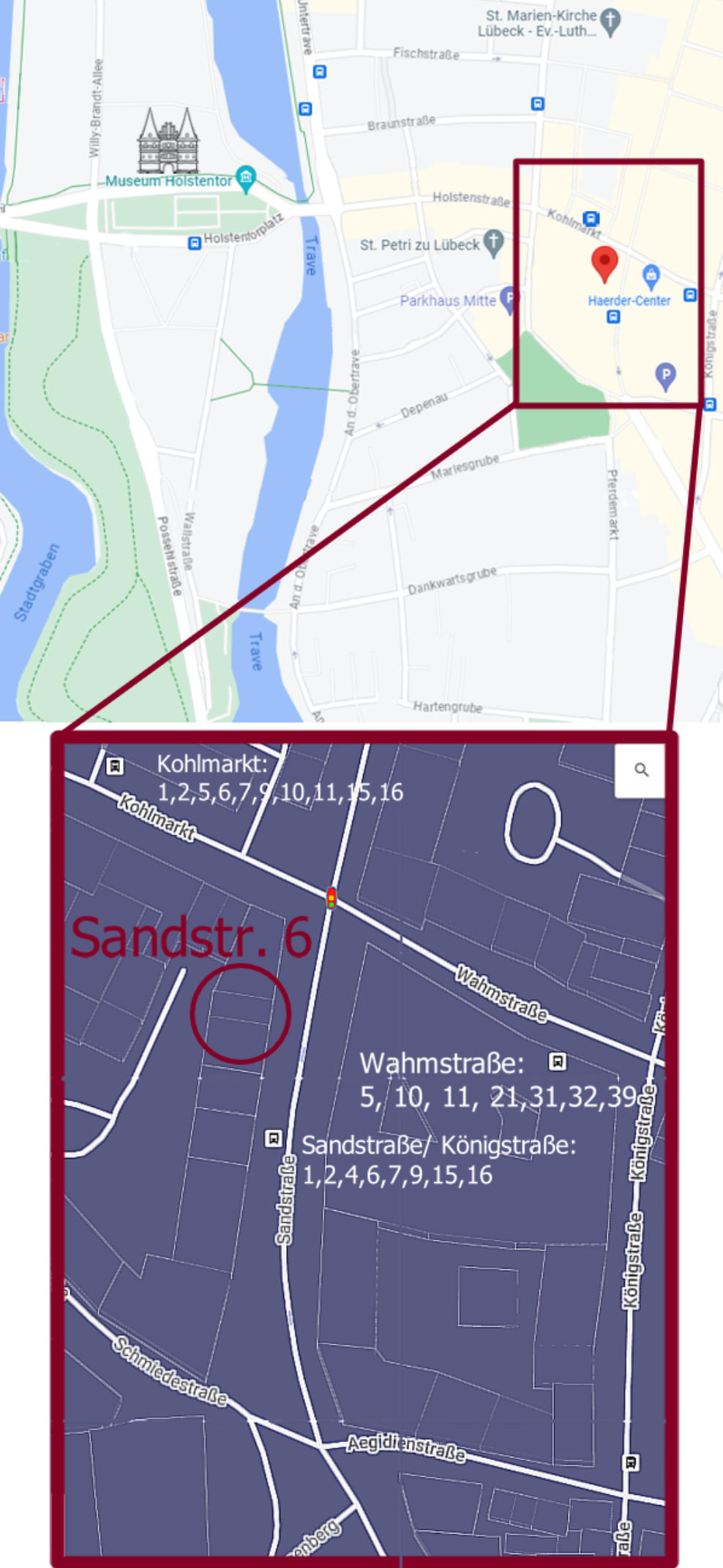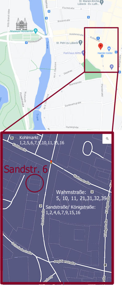 Die Räume befinden sich in der Lübecker Innenstadt. In unmittelbarer Nähe befinden sich Bushaltestellen.