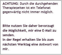 Durch die durchgehenden Therapiezeiten ist ein Telefonat gegenwärtig nicht immer möglich.
